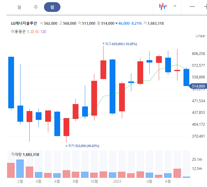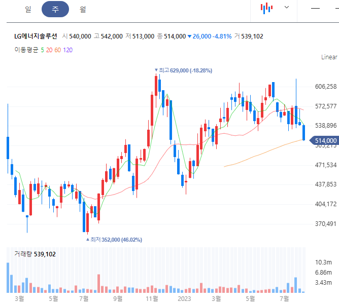 2022년 LG화학에서 물적분할을 해서 보호예수물량이 나옴으로써 주가가 지지부진하는데요. 일봉. 주봉. 월봉상의 분석을 해보겠습니다.
